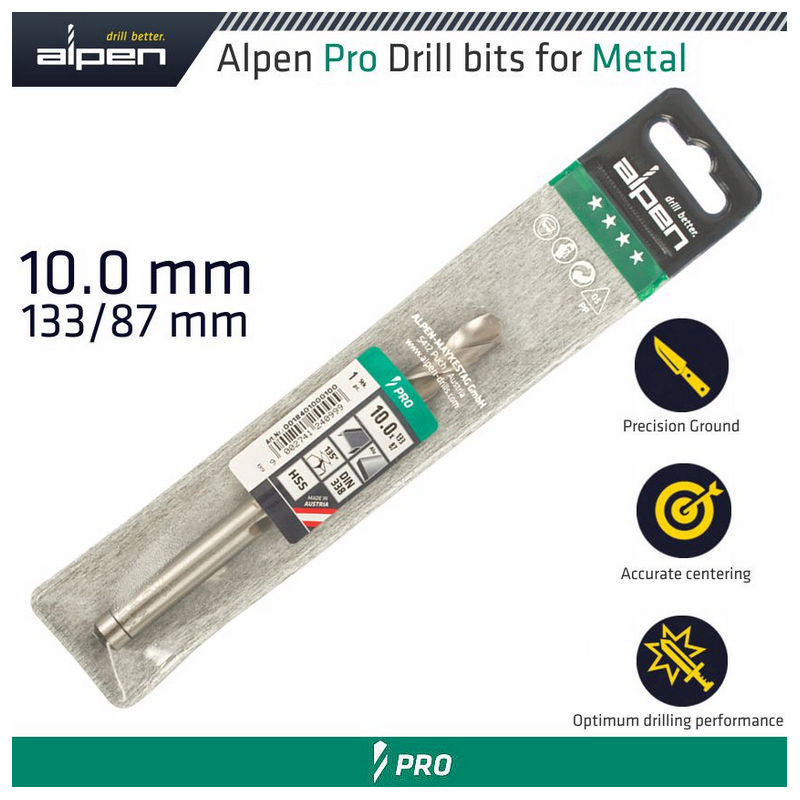 Alpen Pro HSS 10mm Drill Din 338 Rn 135 Split Point Plastic Wallet