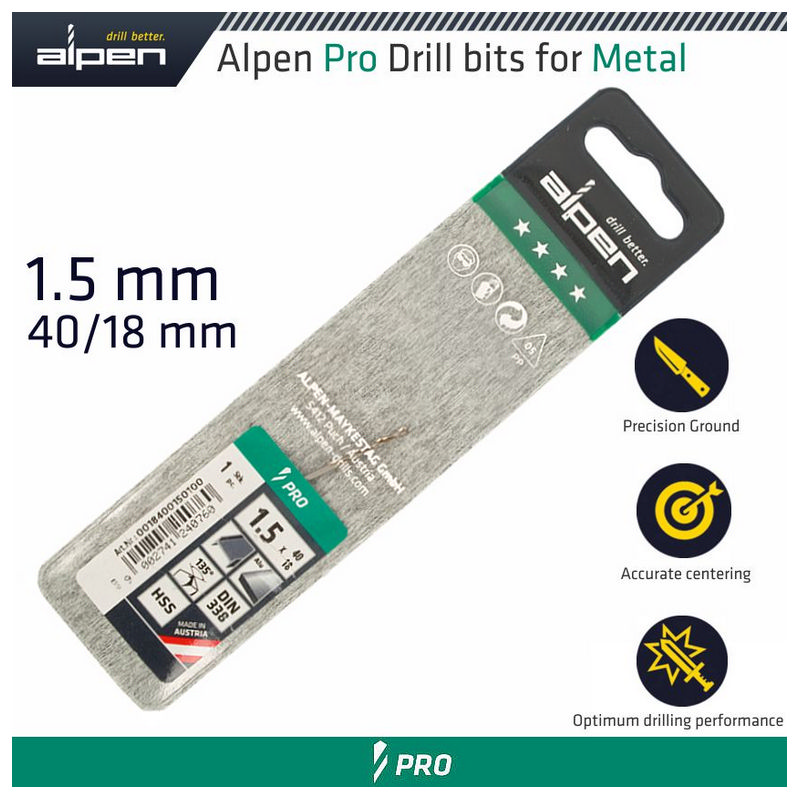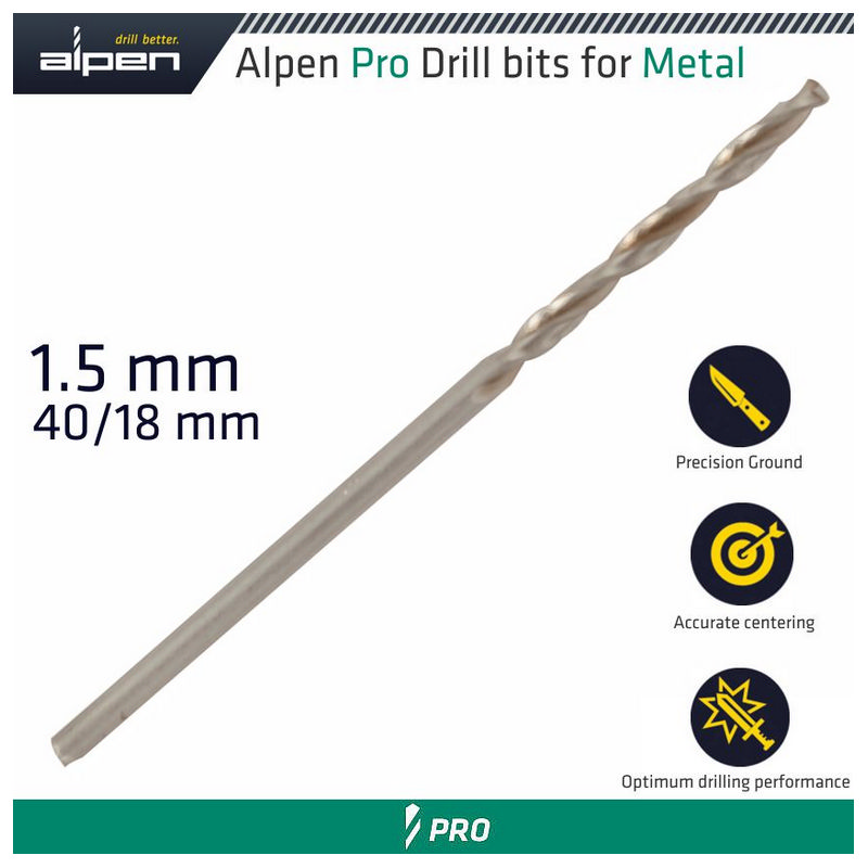Alpen Pro HSS 1.5mm Drill Din 338 Rn 135 Split Point Plastic Wallet