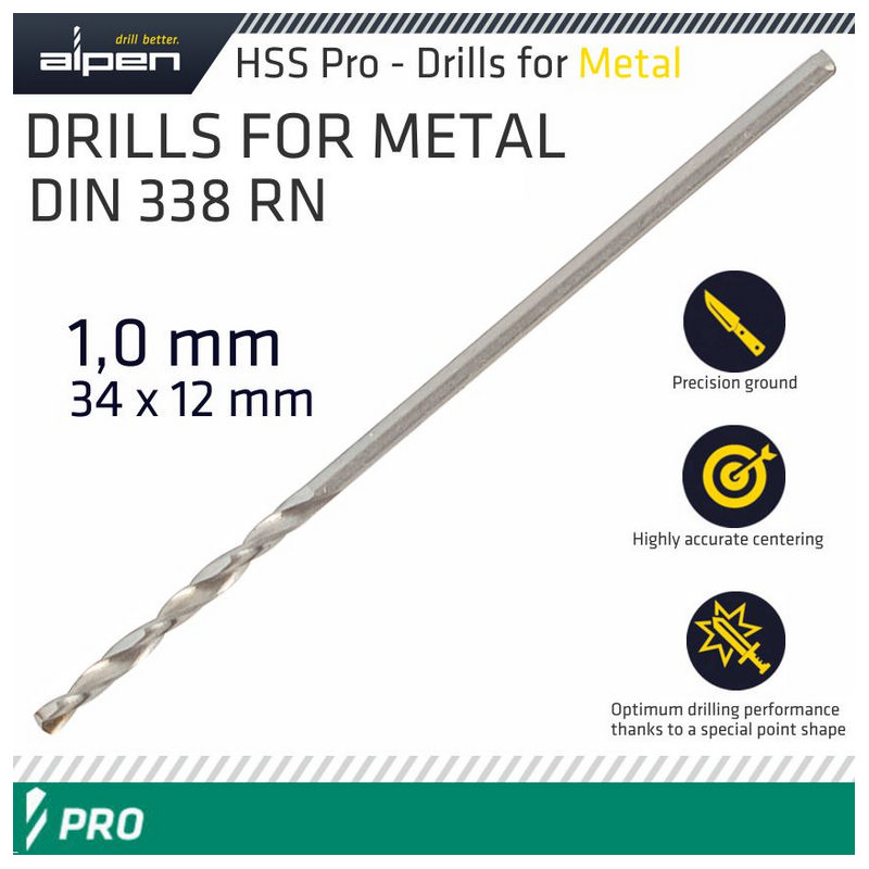 Alpen Pro HSS 1mm Drill Din 338 Rn 135 Split Point Plastic Wallet