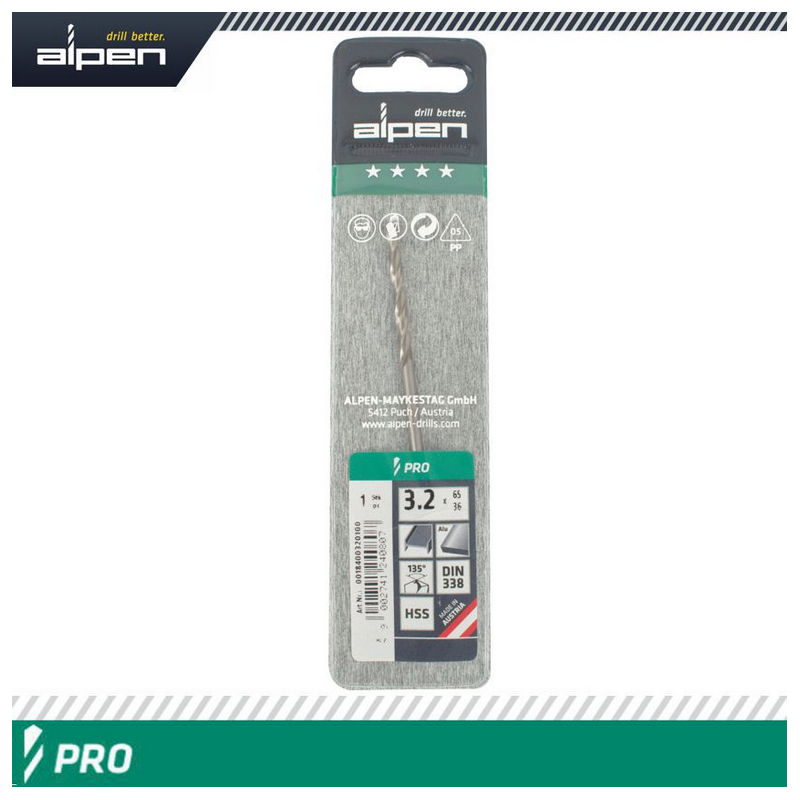 Alpen Pro HSS 3.2mm Drill Din 338 Rn 135 Split Point Plastic Wallet