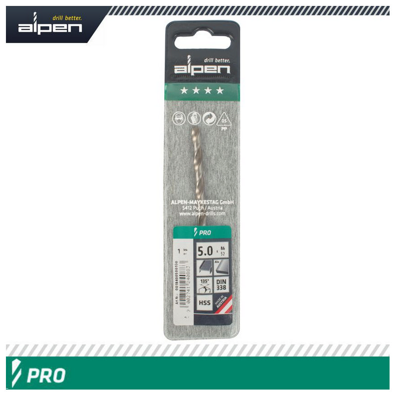 Alpen Pro HSS 5mm Drill Din 338 Rn 135 Split Point Plastic Wallet