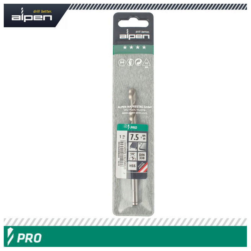 Alpen Pro HSS 7.5mm Drill Din 338 Rn 135 Split Point Plastic Wallet