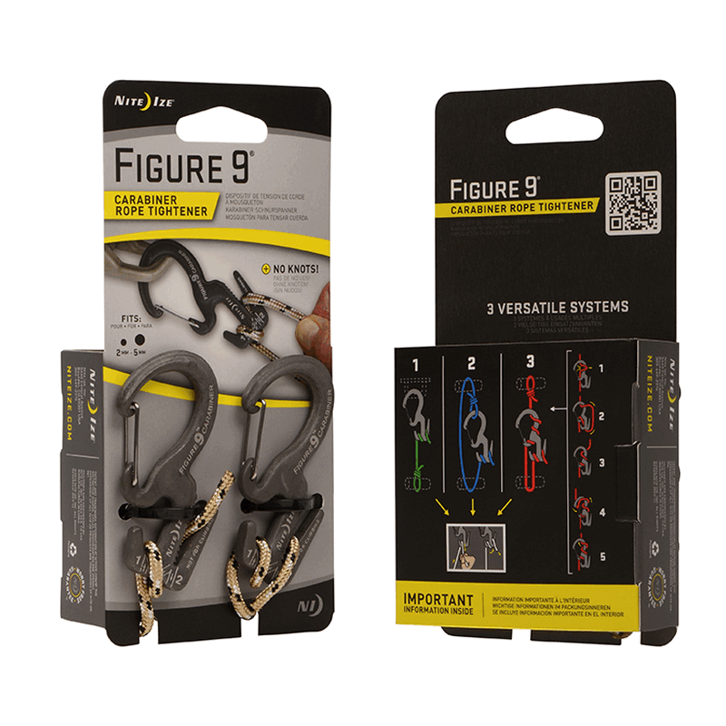 The Nite Ize Figure 9 Carabiner tightens, tensions, and secures ropes without knots. Whether tethering a canoe to your vehicle, anchoring boxes to a dolly, or bundling wood, this carabiner secures large loads quickly and keeps tension where you need it. Loop your rope through its strategically designed prongs, pull it tight, and it stays that way.