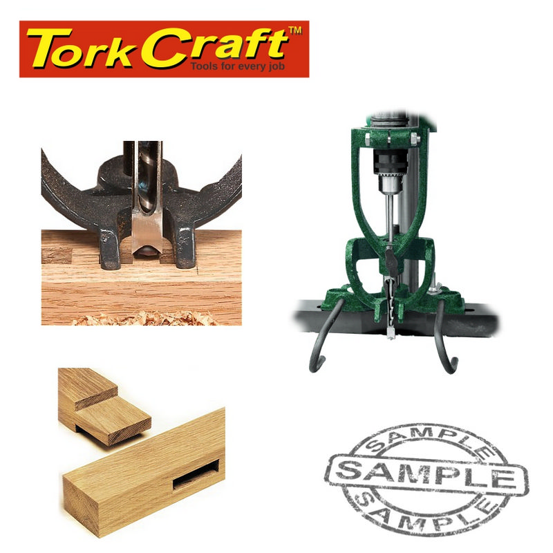 The Tork Craft hollow mortise chisel mortising attachment This mortising attachments also include a stock hold-down, which connects to your drill press table. This hold-down will hold your stock (wood) firm when the square chisel is withdrawn from the stock. Using this attachment makes cutting mortises safer and quicker, so resist the urge to cut your mortises without it.