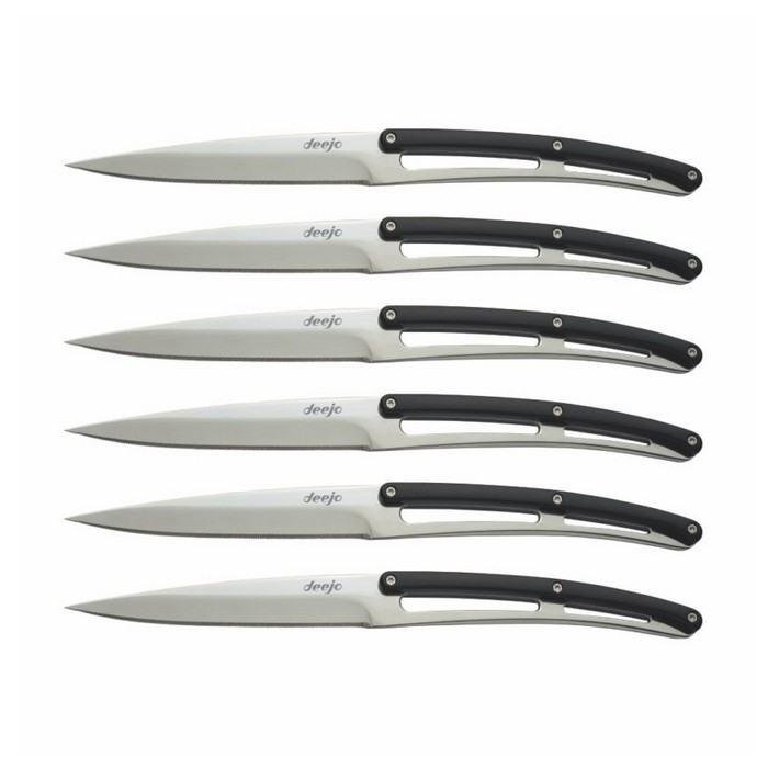 Set of six table knives with a fixed serrated blade (non-folding) in 420 stainless steel with a mirror finish. The handle is plated on both sides with black ABS. 100% dishwasher safe.