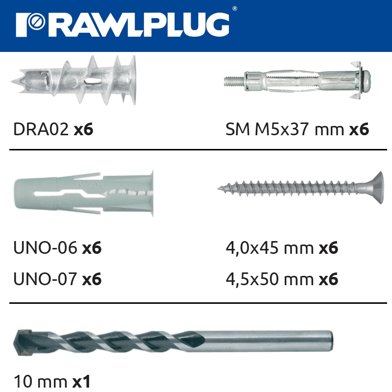 RAWLPLUG Bathroom Accessory Kit 37 Pce Dra02X6 Sm05X6 Uno 6.7 With Screws