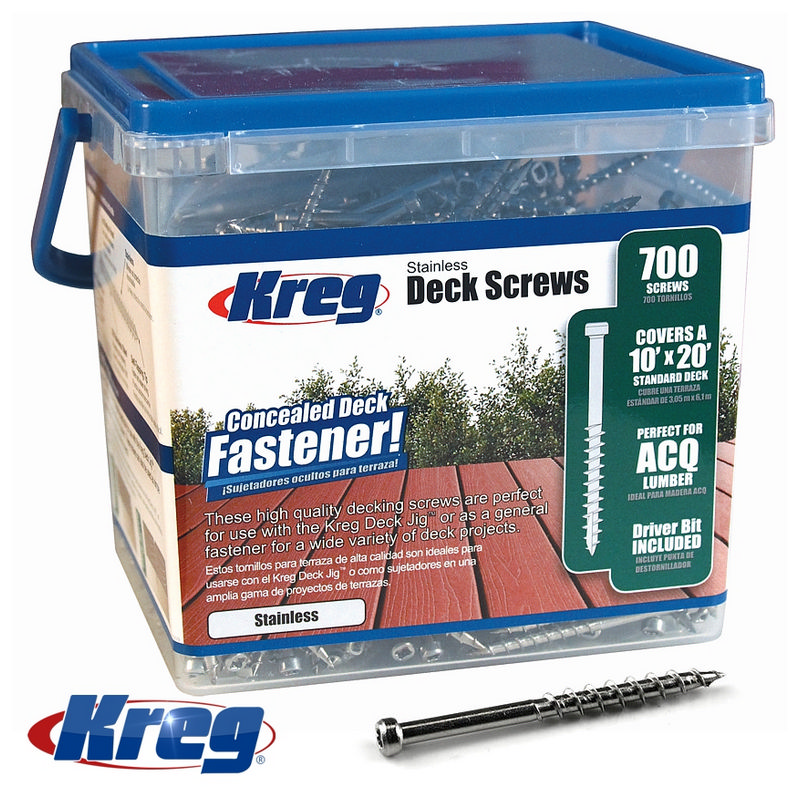These high quality decking screws are perfect for use with the Kreg Deck Jig™ or as a general fastener for a wide variety of deck projects. Stainless screws provide the ultimate in rust/corrosion resistance in the long term. Uniquely designed to stand up to indirect maritime applications and other exceedingly corrosive environments.