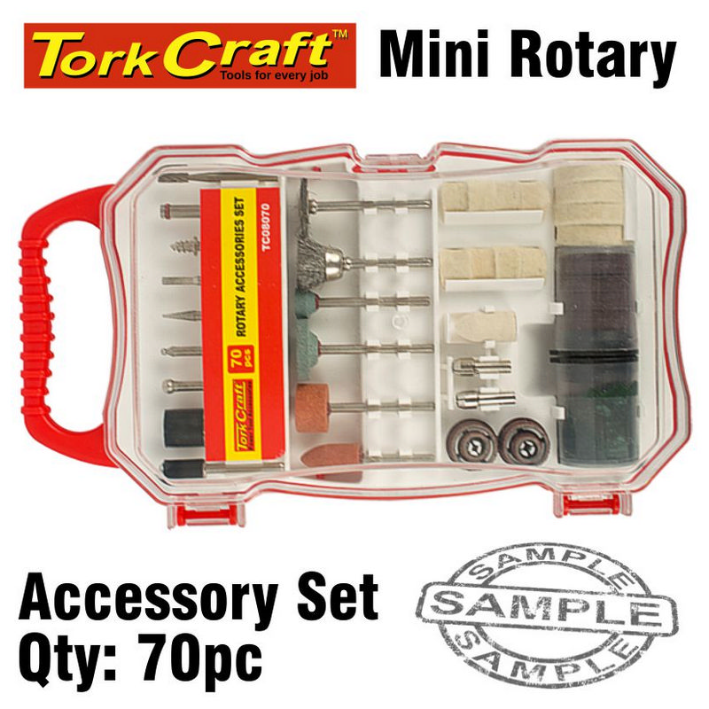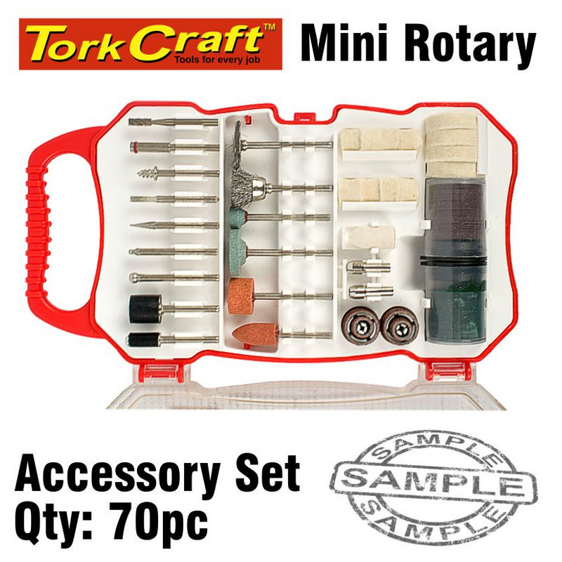 The set includes a total of 70 mini tools that can be used with any Tork Craft rotary mini tools.