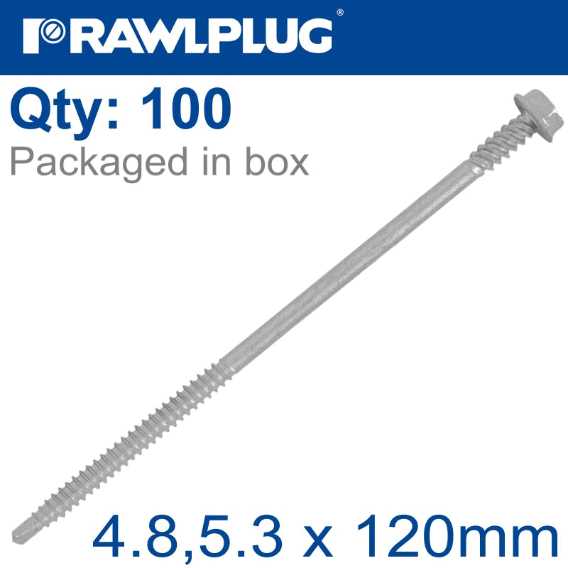 RAWLPLUG R-Wb Self-Drilling Screws For Steel,Hex 4.8,5.3X120 Zinc Fl Box Of 100