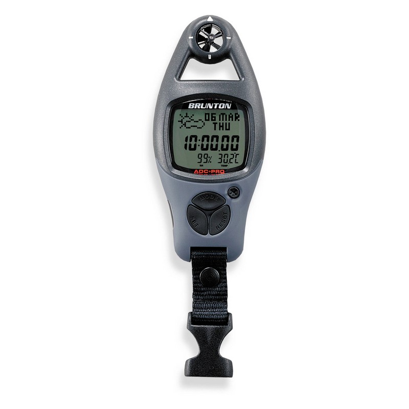 Brunton ADC Pro Handheld Weather Station Product Info The most comprehensive data center available to backcountry explorers and outdoor professionals. Measures, counts, tracks, interprets, forecasts and logs virtually every aspect of your trip. Because knowledge is power. Features: Weatherproof / submersible Current Temperature Current wind speed Maximum wind speed Average wind speed Wind Speed alarm Wind chill Minimum wind chill Wind chill alarm Current water speed 12/24 hour clock Time and date Chronograph Race and countdown timer Weight: 2.4 oz Dimensions: 4.3''x2''x0.8'' Current barometric pressure Past 24 hour pressure graph Prediction for 12 hours weather Storm alarm Current altitude (ft,m) Maximum altitude (ft, m) Altitude alarm Ski run counter IR data communication Manual and automatic data logging Current relative humidity Air density Relative air density Heat index (F, C) Dew point (F, C) Wet bulb (F,C) Density altitude (ft, m) Package Contents: Brunton ADC Pro Handheld Weather Station